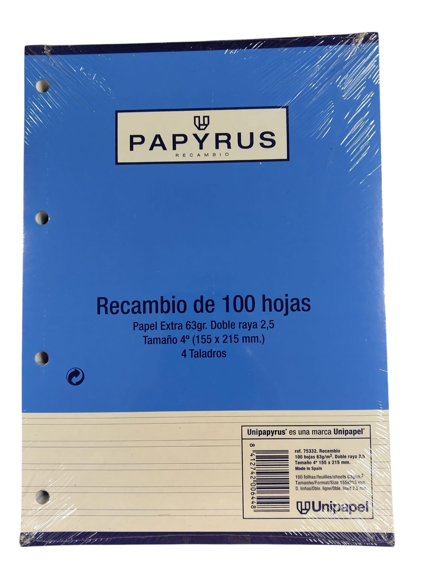 El recambio Papyrus tamaño A4 es la mejor opción para mantener organizados tus apuntes y documentos. Con doble raya 2,5 y margen, permite una escritura ordenada y clara, perfecta para matemáticas, dibujo técnico o estudios de ingeniería.